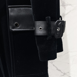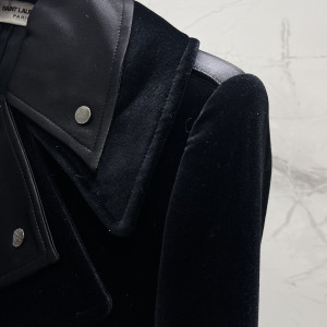 SAINT LAURENT 가을겨울 신상품 벨벳 소재와 아세테이트를 조합한 트렌치코트 외투입니다. 페이크 레이어드 효과로 독특한 디자인을 연출하며, 고급스러운 소재를 사용한 볼륨감 있는 코트입니다. 매우 세련되고 패셔너블한 심플한 디자인으로 제작되었습니다. 사이즈는 S, M, L로 구성됩니다.