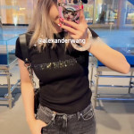 Alexander wang 2026 봄여름 신상품으로 패셔너블하고 심플한 크리스탈 레터링 핫픽스 장식이 특징입니다. 스위트한 느낌의 신축성 있는 슬림핏 라운드넥 반팔 티셔츠로 S, M, L 사이즈로 구성되어 있습니다.
